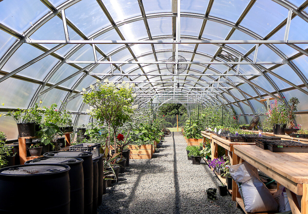 We use repurposed 30 and 55-gallon drums as thermal mass inside the greenhouse, collected from golf course superintendents across Vancouver Island.